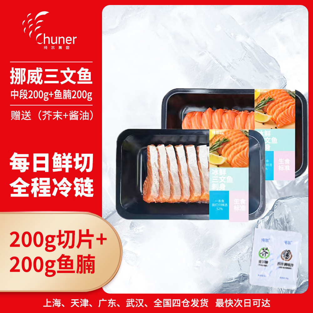 包邮 纯尔挪威三文鱼可生食刺身200g背部 + 200g鱼腩 源头直发 可生食